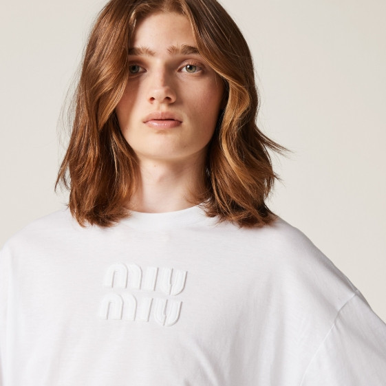 미우미우 자수 로고 코튼 티셔츠 (화이트,그레이) > 긴팔/셔츠