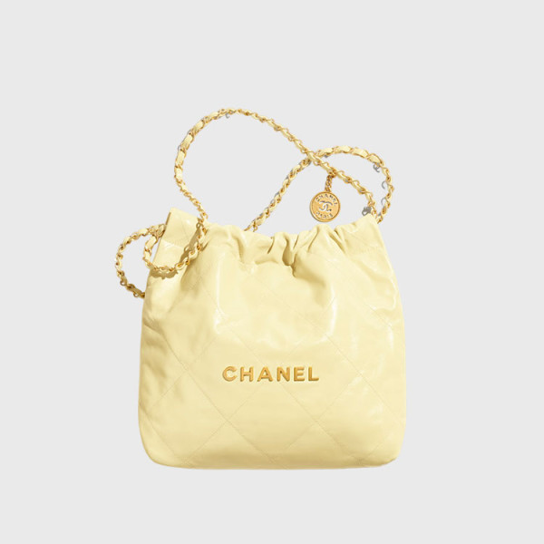 샤넬 22 스몰 핸드백 유광 카프스킨 & 골드 메탈 라이트 옐로우